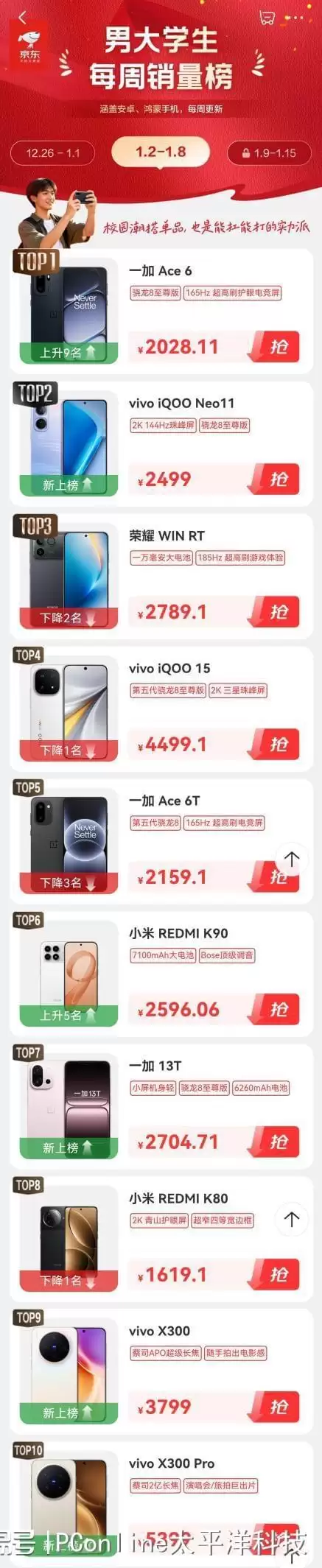 1月2日至1月8日的“男大学生每周手机销量榜”TOP10依次为:一加 Ace 6、iQOO Neo11、荣耀WIN RT、iQOO 15、一加 Ace 6T、Redmi K90、一加 13T、Redmi K80、vivo X300、vivo X300 Pro。其中,一加 Ace 6搭载骁龙8至尊版芯片,配置新一代风驰游戏内核,游戏体验流畅;它还搭载了电竞网络芯片G2和灵犀触控芯片,并配备了游戏主机手柄同规格陀螺仪;内置的7800mAh冰川电池,支持120W超级闪充,续航和回血速度都令人满意。