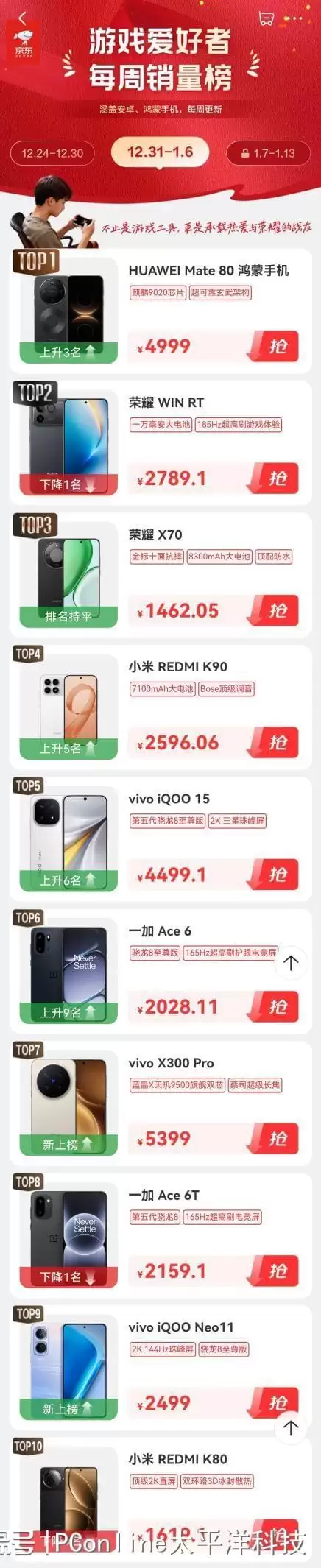 京东手机游戏榜单揭秘:华为Mate 80登顶周销量榜首