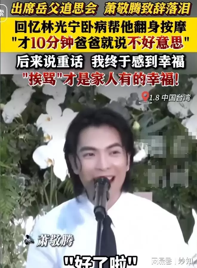 当轮到他上台致词时,萧敬腾哽咽说道:“我的岳父林光宁是我永远的骄傲,您放心!我会努力照顾好这个家,我是您永远的女婿萧敬腾。爸,我爱您!”