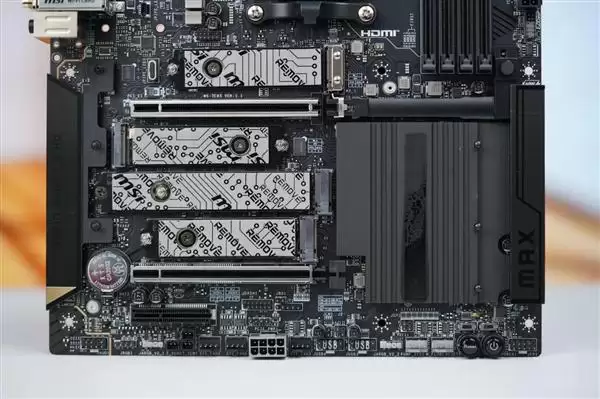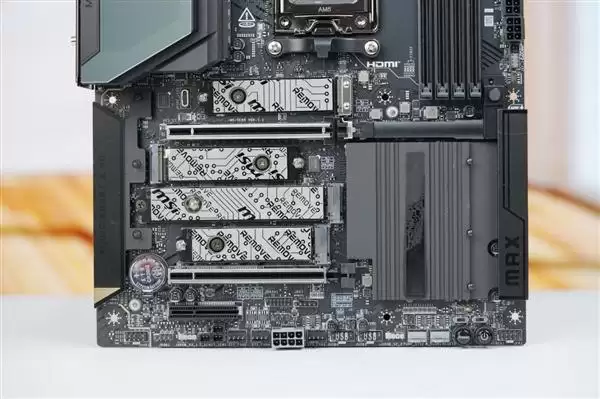 板载五个M.2接口,其中双接口支持PCIe 5.0高速协议,其余接口亦保持高速传输水准,满足多设备同时接入需求。