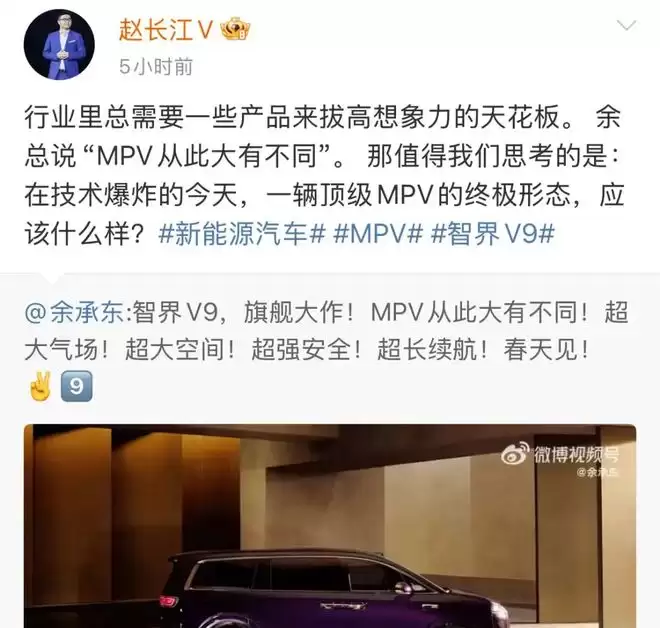 在其登上工信部之后,华为常务董事,终端BG董事长余承东也随即在社交媒体发文,提到了智界V9“春天见”,而且值得一提的是,原比亚迪腾势事业部总经理赵长江还转发了这条消息,此前就有传闻称,从比亚迪离职后加入了智界汽车担任营销负责人。