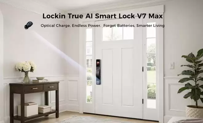 在这样的现实背景下,鹿客在 CES 2026 上抛出了新款旗舰智能门锁 V7 Max,以及可能最亮眼的设计——AuraCharge 隔空光供电。