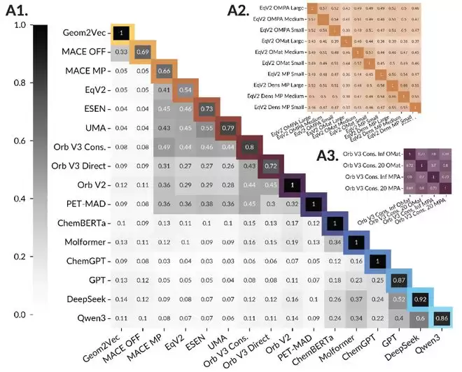跨架构的表征对齐:矩阵中的深色区域显示了Orb V3等高性能模型与其它严谨物理模型(如MACE、EqV2)之间强烈的共鸣。