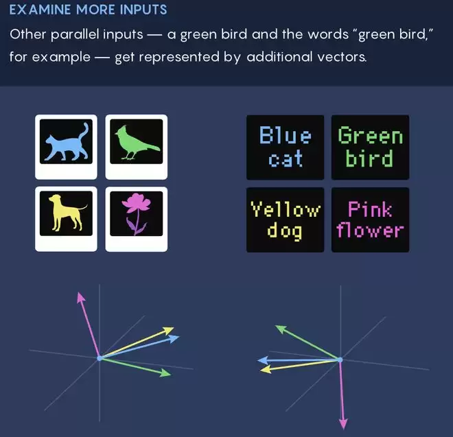 在视觉模型里,「猫」的向量则靠近胡须、圆眼睛、软毛、优雅的尾巴等视觉特征。