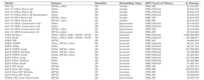 多元架构的对比(部分):论文评估了包括Orb、MACE、DeepSeek在内的近60种模型,为科学家的选择提供了定量依据。