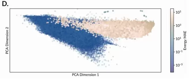 图中白色的点代表模型从未见过的分子结构。可以看到,模型在处理这些结构时误差(MAE)激增,且表征完全偏离了正常的物理分布。