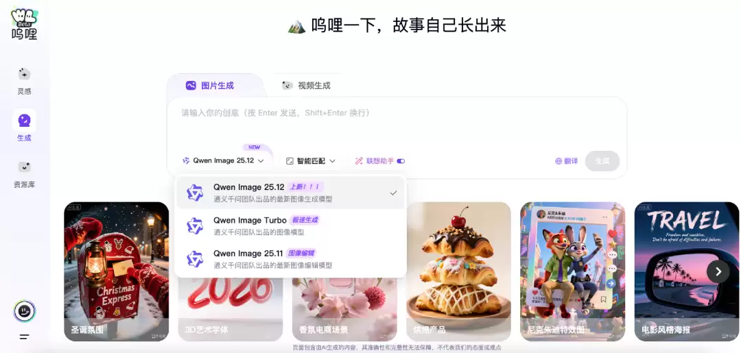 产品功能覆盖广泛,不仅支持图片生成、视频生成等核心功能,还配备了灵感联想助手、翻译等实用工具,同时搭建了丰富的资源库。用户只需输入创意描述,即可快速生成各类内容,涵盖3D艺术字体、电影风格海报、电商场景图、特效图等多种形式,适用于烘焙产品推广、香氛电商营销、旅行内容创作等多个场景,实现其主打的“咕噜一下,故事自己长出来”的创意落地体验。