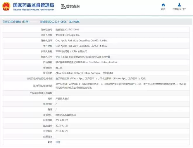 据悉,该项功能的注册名称为“移动脉率房颤踪迹现象记录软件”,并于 2025 年 12 月 26 日正式获批。