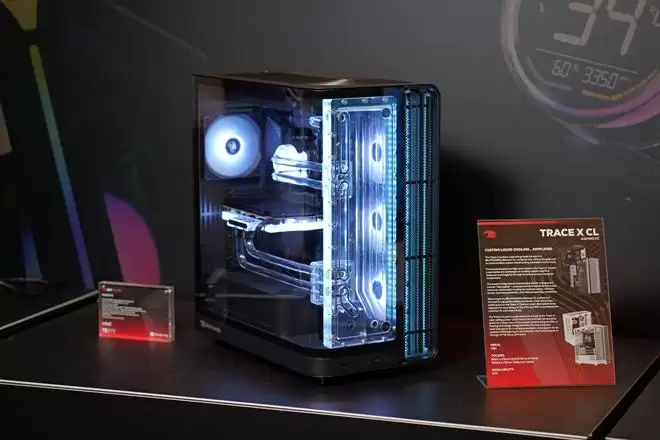 Trace X CL是iBUYPOWER本世代的旗舰分体式水冷整机机箱,拥有弧形玻璃全景视野。其正面集成了一块水道板,整合了分体式水冷的储液罐、水泵及路由功能。
