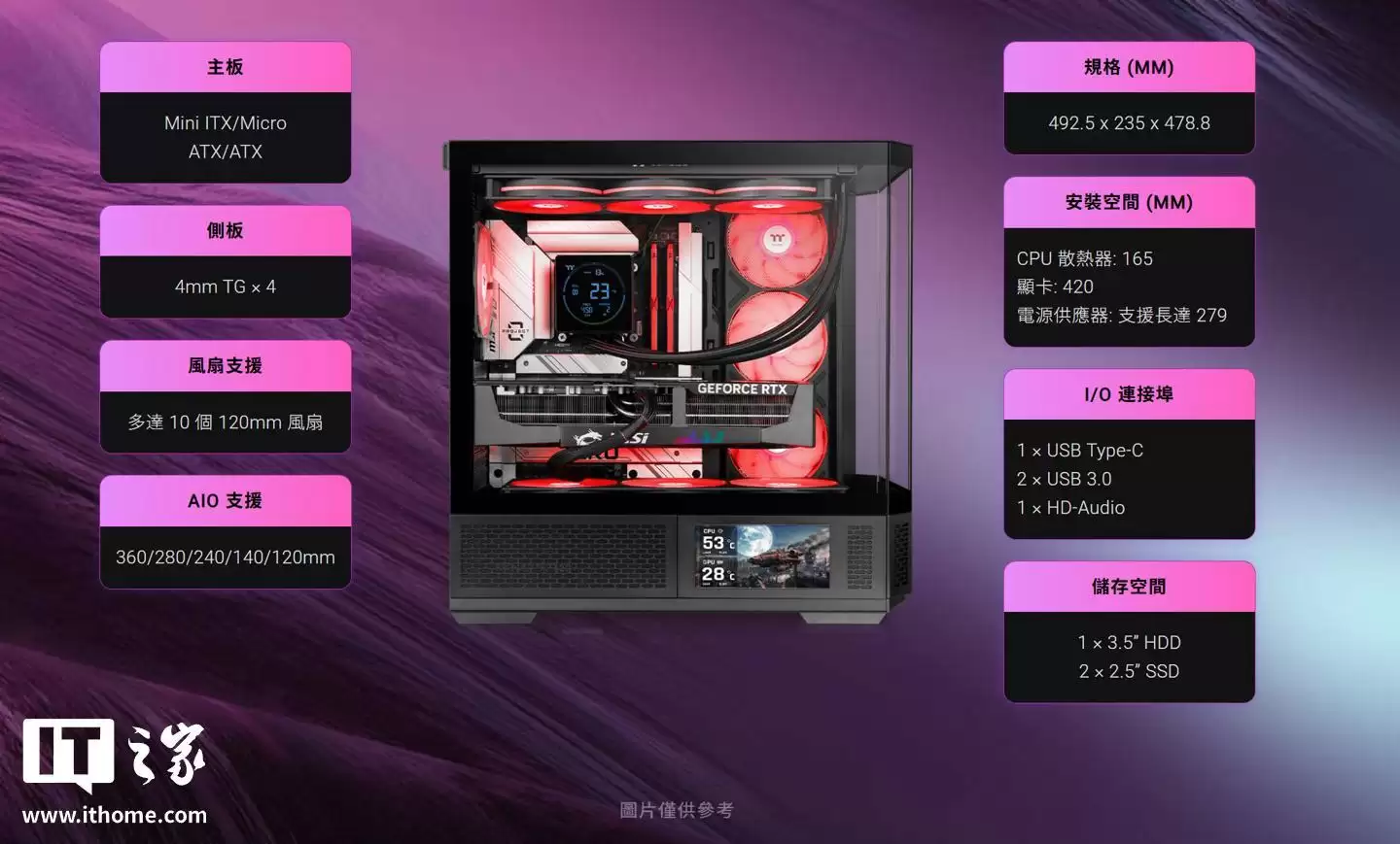 此外,这款机箱最多可安装10个120mm风扇,支持360mm一体式水冷,可以竖插显卡,还能选配6英寸LCD屏幕。