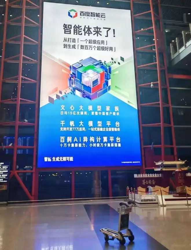 百度对外的叙事覆盖IaaS/PaaS/MaaS,但在机场广告与传播素材里,存在重点不够突出的现象。去年,百度曾拿下首都机场某个长期为高奢包揽的核心广告位。放眼看去,其在版面中提到了MaaS、PaaS与IaaS三层能力,视觉焦点是不够具体的“智能体”。