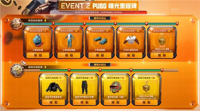 活动二:PUBG曙光里程碑。通过完成活动一累计“新锐启航徽章”和“破晓先锋勋章”,达到对应数量即可在活动页面解锁补给,兑换专属皮肤和G-Coin宝箱等道具。此次可兑换的皮肤包括PUBG朋克毛衣和复古花头盔(3级),特别是这款头盔,造型非常酷炫!
