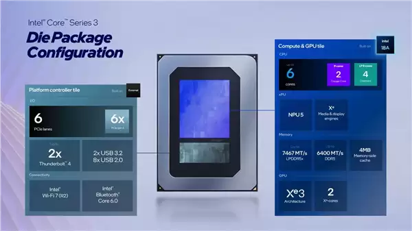 Wildcat Lake在架构设计上延续了英特尔当前的框架,整合了Cougar Cove性能核与Darkmont能效核,并搭载了Xe 3架构核显以及第五代NPU。但与旗舰产品追求极致性能不同,Wildcat Lake的配置明显为低功耗与小体积应用进行了调整: