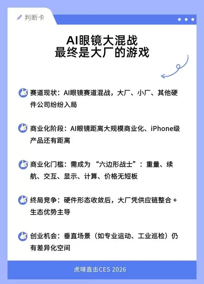 AI眼镜一旦硬件形态收敛,竞争将转向规模与成本,届时拥有供应链整合能力和生态优势的大厂将占据主导地位。但这并不意味着创业者没有机会,垂直场景(如专业运动、工业巡检等)仍然存在差异化的空间。