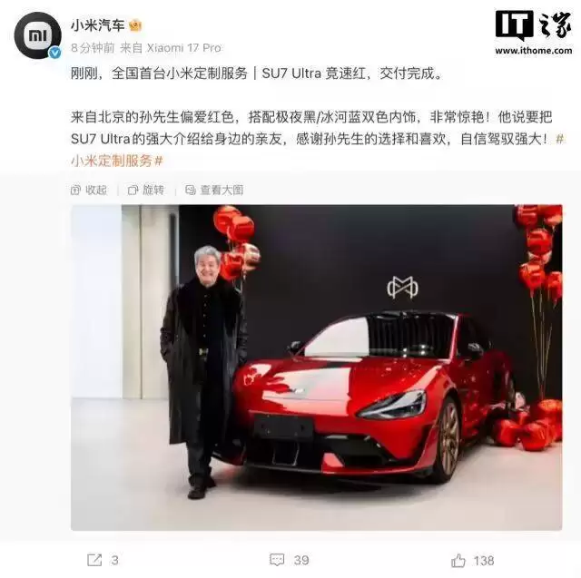 小米汽车近日宣布,全国首台通过小米定制服务打造的车型——SU7 Ultra 竞速红已正式交付车主。这款车凭借别具一格的外观设计与个性化配置,引发了市场的广泛关注。