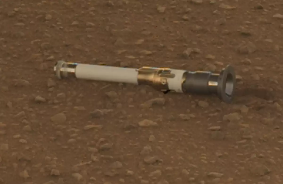 毅力号火星车在火星表面的一个采样管看起来像一把光剑。