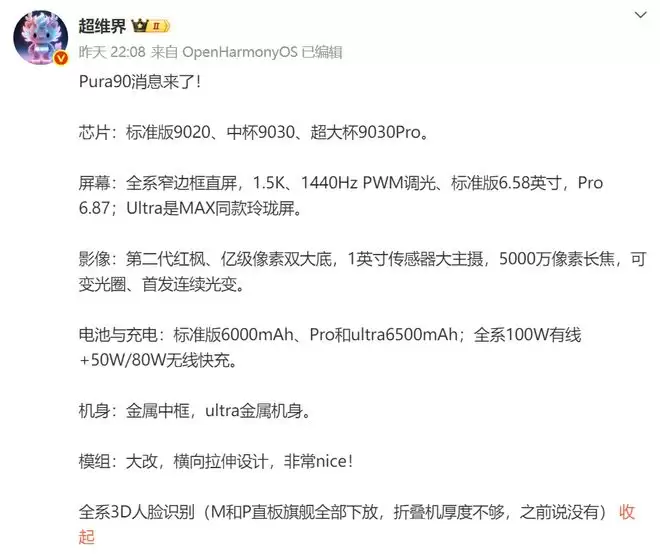 也就是说,华为Pura 90系列的各方面配置信息都非常的清晰,且新机的发布时间方面也已经没有特别大的悬念了。