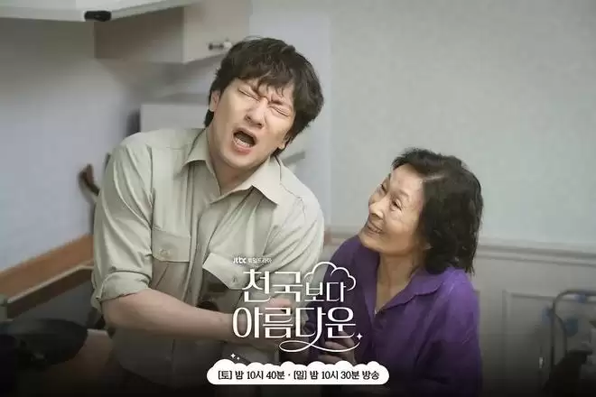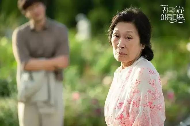 海淑与诺俊的爱情,早在人间就褪去了浪漫的包装。年轻时的诺俊意外瘫痪,把海淑从可以穿碎花裙的姑娘 变成了市场里人人避之的放债恶婆婆。诺俊的爱则藏在沉默里。他瘫痪在床,看着妻子被生活磋磨,只能用一句“你现在最美丽”作回应。这句话也成了海淑的精神支柱,让她觉得所有付出都有意义。