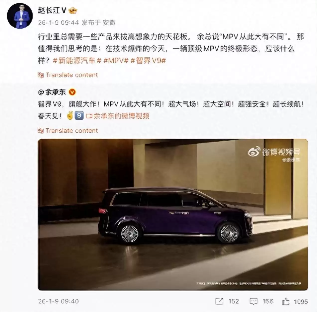 余承东近日在社交平台宣布,鸿蒙智行旗下首款旗舰级MPV车型智界V9将于春季正式发布。消息一出,迅速引发行业内外广泛关注。随后,赵长江转发了相关动态并热情参与互动,他评价这款车将为行业树立新的标杆,并在回应网友提问时表示,其竞争力强大,三年内恐难逢对手。这番充满信心的表态,进一步推高了市场对这款新车的期待值。