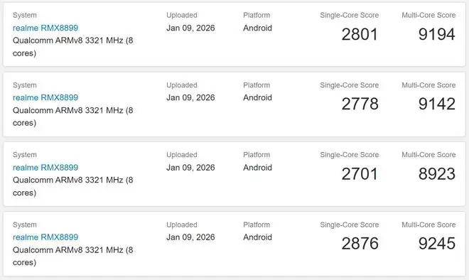 1月10日,一款型号为“RMX8899”的realme真我手机在GeekBench跑分库中亮相。跑分页面共记录四次测试,其中成绩最佳的一次单核得分2876,多核得分高达9245分。根据此前GSMA IMEI数据库信息,这款型号对应的正是即将发布的realme真我Neo8手机。