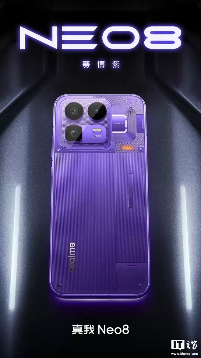 真我Neo8被定位为“开年越级大作”,官方已经宣布“本月见”。其“赛博紫”配色方案也已公布,新机采用透明RGB设计,同时,标志性的觉醒光环元素也在这款机型上得到了回归。