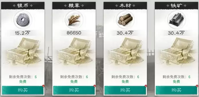 美重站每天都会为玩家提供免费的资源领取机会,这个机会不用白不用。进入国家界面就能找到美重站的位置,点进去之后会看到几种不同的资源可以选择。粮草、木材、铁矿、银币这些基础资源都有,玩家可以根据自己当前最缺的资源来选择领取。