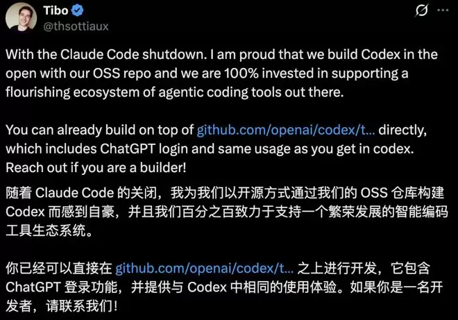 OpenAI的Codex工程负责人Thibault Sottiaux(网名Tibo)更是不失时机地推销起自家agentic coding tools(智能代理编码工具)生态系统的开放性。