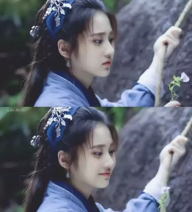 一袭蓝衣,耳后簪花,清丽淡雅,也有点女儿家的娇憨可爱。