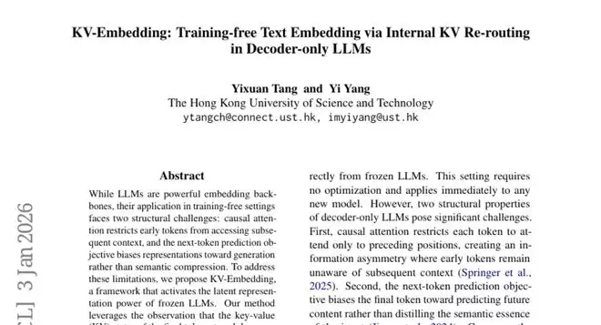 A:KV-Embedding是香港科技大学开发的一种让AI模型更好理解文本的新技术。它通过重新安排模型内部的信息流动方式,让模型在处理任何一个词时都能参考到全文的整体信息,就像在文章开头放置一个包含全文内容的摘要索引。