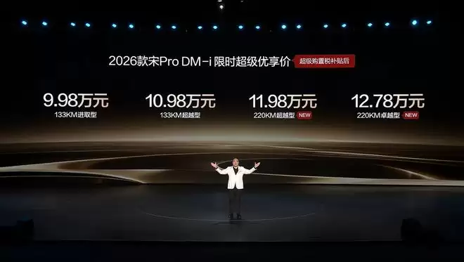 而此次2026款宋Pro DM-i在续航、智能化和安全方面全面升级。结合9.98-12.78万元的限时超级优享价,2026款宋Pro DM-i有望成为同级车型中的有力竞争者。