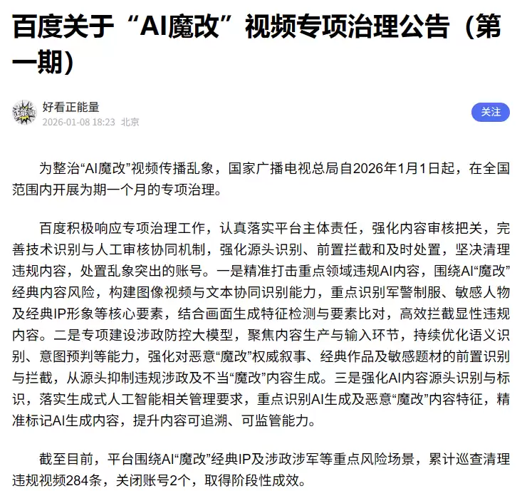 百度平台将治理重点放在AI篡改经典IP及涉政涉军等高风险领域,通过动态巡查机制清理违规视频284条,关闭2个恶意传播账号。微博平台建立“AI魔改”内容预警系统,拦截违规视频190余条,并对7个违规账号实施阶梯式处罚,包括阶段性禁言至永久封禁等措施。