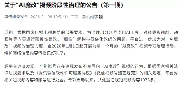 多家主流网络平台积极回应治理要求,陆续公布首周治理成果。微信平台通过技术筛查与人工审核相结合,累计清理违规短视频1078条,涉及篡改经典剧情、扭曲历史人物形象等内容。抖音平台同步开展专项排查,截至1月8日已处置违规视频1075条,重点打击利用AI技术对红色经典进行低俗化改编的行为。