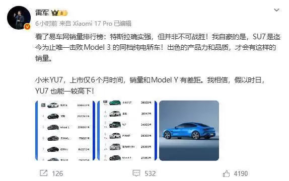 近日,小米集团创始人、董事长兼CEO雷军在社交平台发布动态,对小米汽车的市场表现给予高度评价。他援引相关平台发布的销量数据指出,在竞争激烈的纯电轿车市场中,小米SU7已成功实现对特斯拉Model 3的超越。