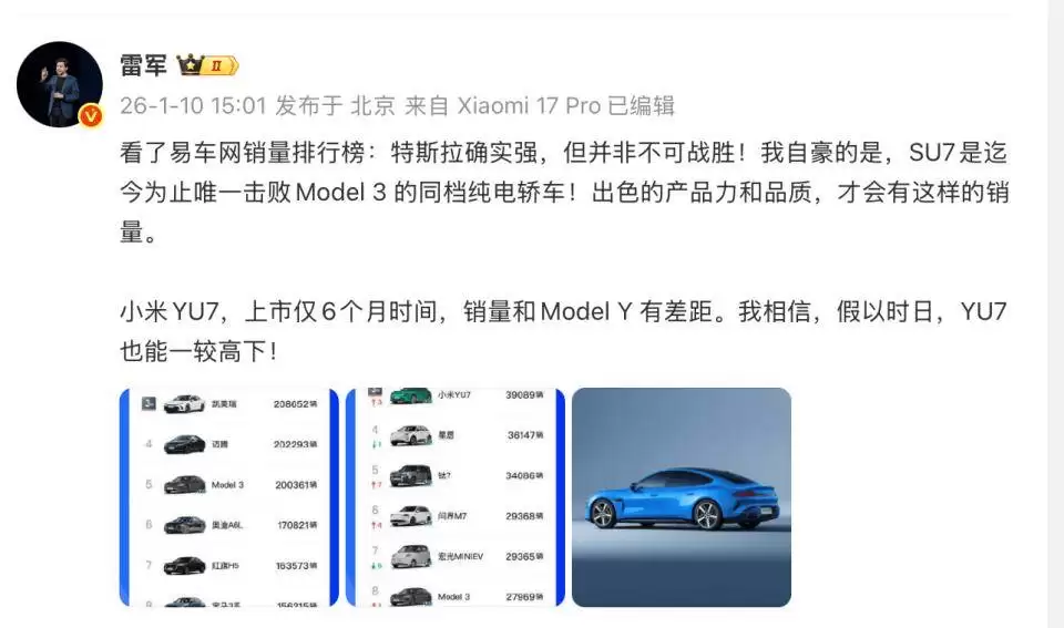 小米科技创始人雷军近日在社交媒体平台分享了其对旗下电动车车型市场表现的看法。他特别提到,在某汽车资讯平台发布的最新销量榜单中,小米SU7在同级别纯电轿车领域展现出强劲竞争力,成功超越特斯拉Model 3,成为细分市场销量冠军。这一成绩被雷军视为对小米汽车产品力与制造品质的直接肯定。