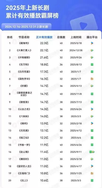 2025年新剧播放排行:第一22.3亿,《许我耀眼》位列前三