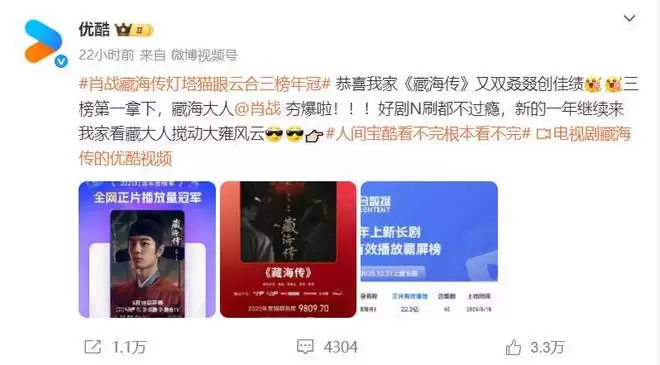 我们可以看到,《藏海传》的正片有效播放达到22.3亿,成功登顶2025年上新长剧累计有效播放霸屏榜。今年年初,酷又发了一遍《藏海传》的战报,从这点上看,最新是真的满意这部剧取得的成绩。