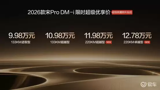 比亚迪近期推出了宋Pro DM-i 2026款长续航版本,以9.98万元至12.78万元的限时售价,精准切入A级插混SUV市场。这款新车通过电池技术的升级与智能生态的深度融合,重新定义了家庭用车在实用经济性与多场景适应性方面的标准,堪称同级市场中纯电续航里程的新标杆。