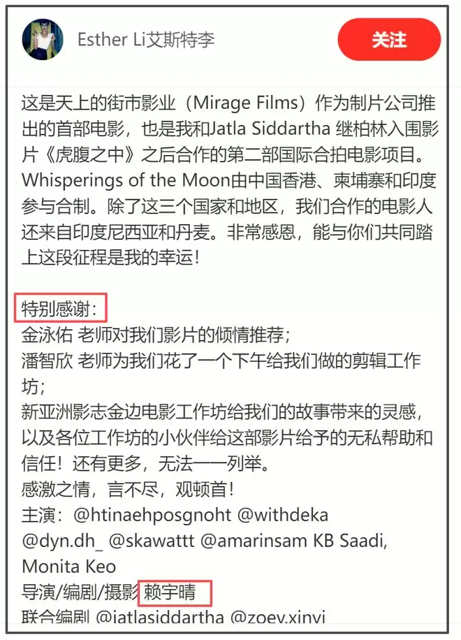 据悉,赖宇晴这次入围的作品便是《潮汐低语》,虽然她才是导演和编剧,但座谈时依然是印度男坐在中间,可见印度男在团队中的地位颇高,赖宇晴也很尊重她。