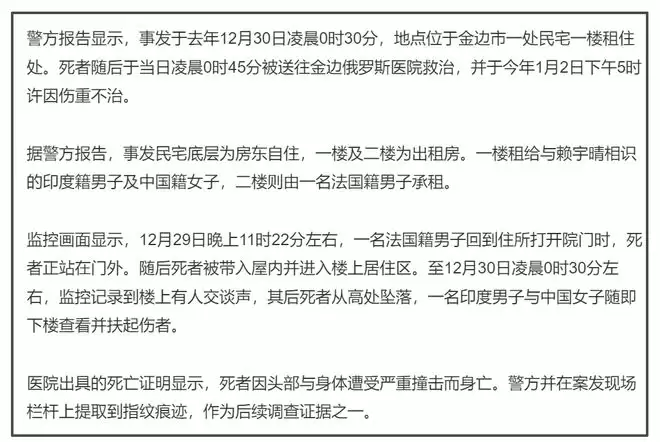 回顾下案件的经过,去年12月30日凌晨,赖宇晴坠楼后被送往医院救治,1月2日伤重不治后身亡。事发地点一共有三层,底层为房东自住,一楼租给了与赖宇晴相识的印度籍男子和中国籍女子,二楼则由法国男子承担。