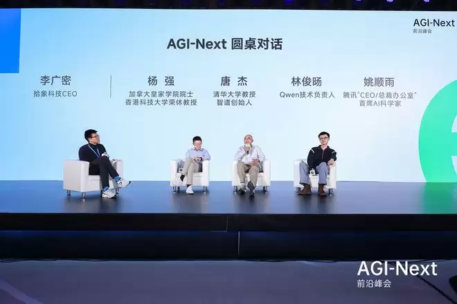 加拿大皇家科学院院士和工程院院士杨强、智谱创始人唐杰、Qwen负责人林俊旸和主持人、拾象科技创始人李广密在台上一一落座。