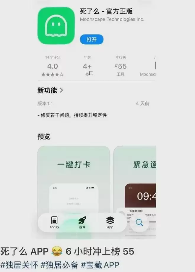 【“死了么”APP引争议,开发者回应】1月8日,苹果应用商店一款名为“死了么”的App受到关注。截至发稿时,该款App在苹果付费软件排行榜位列第一。据介绍,该应用是为独居人群打造的轻量化安全工具,用户需要设置紧急联系人并签到,若连续多日没在应用内签到,系统将于次日自动发送邮件告知紧急联系人。1月10日,记者采访到该App的创始开发团队成员之一吕先生。据吕先生介绍,团队内只有三人,都是“95后”,大家平时都有自己的工作,通过远程方式进行协作。为什么要开发这样一款App?吕先生表示,早在两三年前他们就在社交平台上留意到相关需求,“近几年大家都会讨论‘什么APP是每个人都需要的,并且一定会下载的’,就有网友提到‘死了么’App,这个创意出来之后有很大的讨论度,于是我们看到了其中的需求,并且这件事本身也很有意义,于是我们就尝试去注册这个名字,发现可以注册,后续又用了一个月时间完成了开发。”(广州日报)