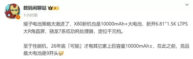 而根据博主的最新爆料,荣耀X80的核心卖点在于其极致的能效组合,10000mAh级电池搭配高通骁龙7系低功耗处理器,这种配置组合显然是为了追求极致的续航时长。