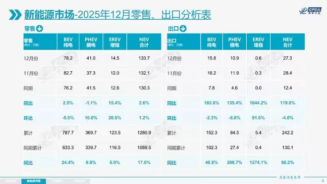 2025年新能源乘用车零售、出口数据 乘联会