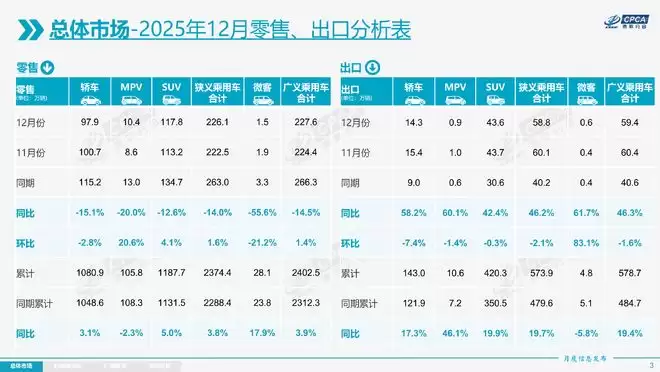 中国乘用车市场在2025年交出了一份亮眼的成绩单。根据乘联会统计,全年累计生产汽车2963.3万辆,同比增长10.4%;批发销售2955.4万辆,同比增长8.8%;终端零售销量达到2374.4万辆,同比增长3.8%。