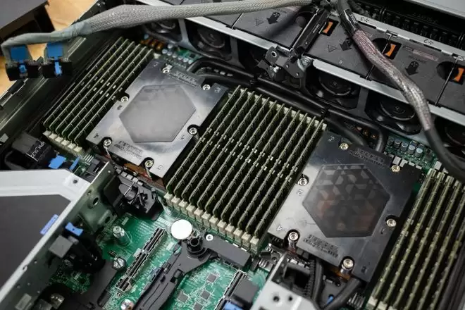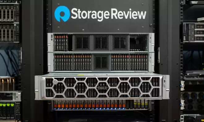 使得单服务器计算可能的另一个因素,是第 17 代 Dell 服务器的存储背板中没有使用PCIe交换机,而是直接连接到CPU的PCIe 通道。拥有 40 个插槽,这意味着每块 SSD 可以使用 2 到 4 条通道,读写性能高达 280 GB/s,远高于StorageReview 之前实验中的数据。