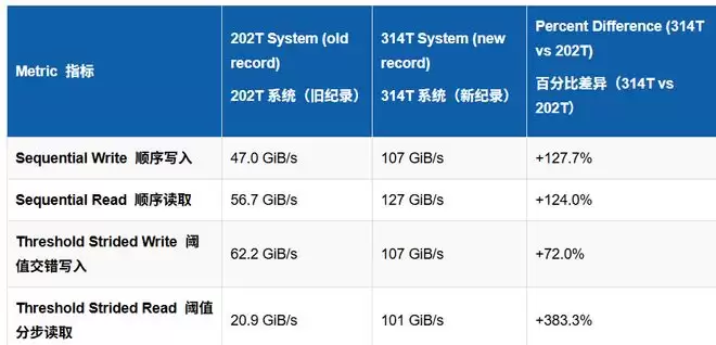 计算过程中,在存储调度时,部署 40 块 Gen5 NVMe SSD,其中 34 块用于计算中间结果,共提供约 2.1PB 空间;剩余 6 块构建 RAID10 用于最终 π 结果落盘。顺序读写性能翻倍,部分场景提升最高达 383%。