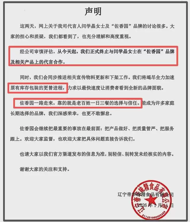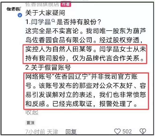 而今,品牌方宣布解约后,也澄清闫学晶并非股东,只是代言合作关系,还否认之前维护闫学晶的账号是最新账号,对此已报警。