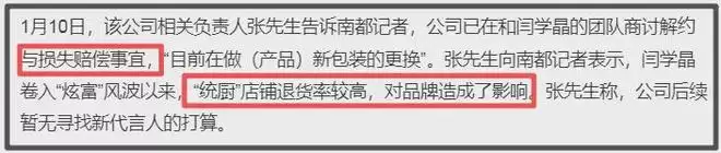 另一家调料品牌也正在商讨与闫学晶解约及损失赔偿,品牌方表示店铺受闫学晶影响出现了退货率较高的情况,公司目前正在更换包装,后续也没有请代言人的打算。