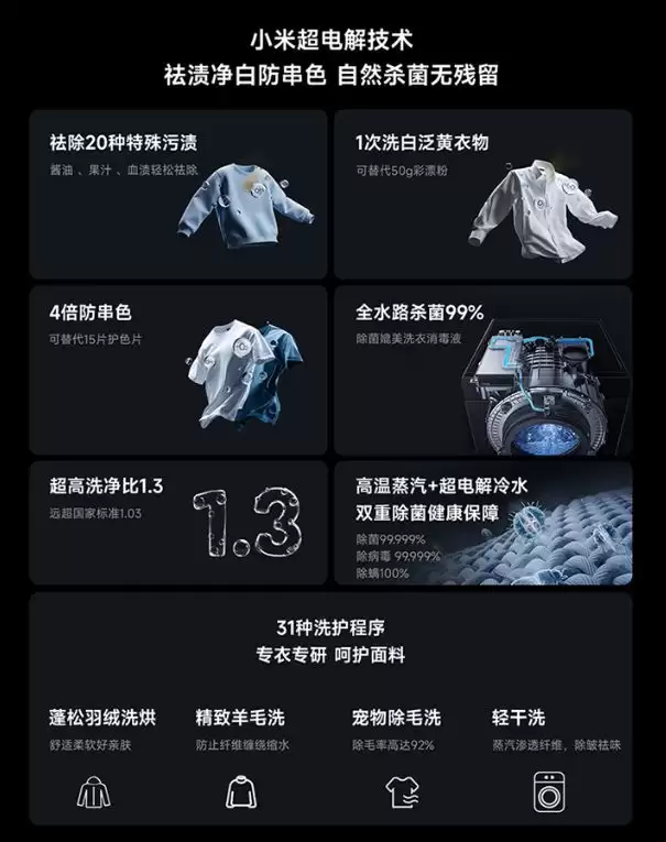 据悉,这款新品支持12kg洗涤与9kg烘干的大容量,拥有1.3的超高洗净比。其搭载的小米超电解技术能有效瓦解污渍,实现深层净白并防止串色,同时支持99.999%除菌率、99.999%除病毒率以及100%除螨率。