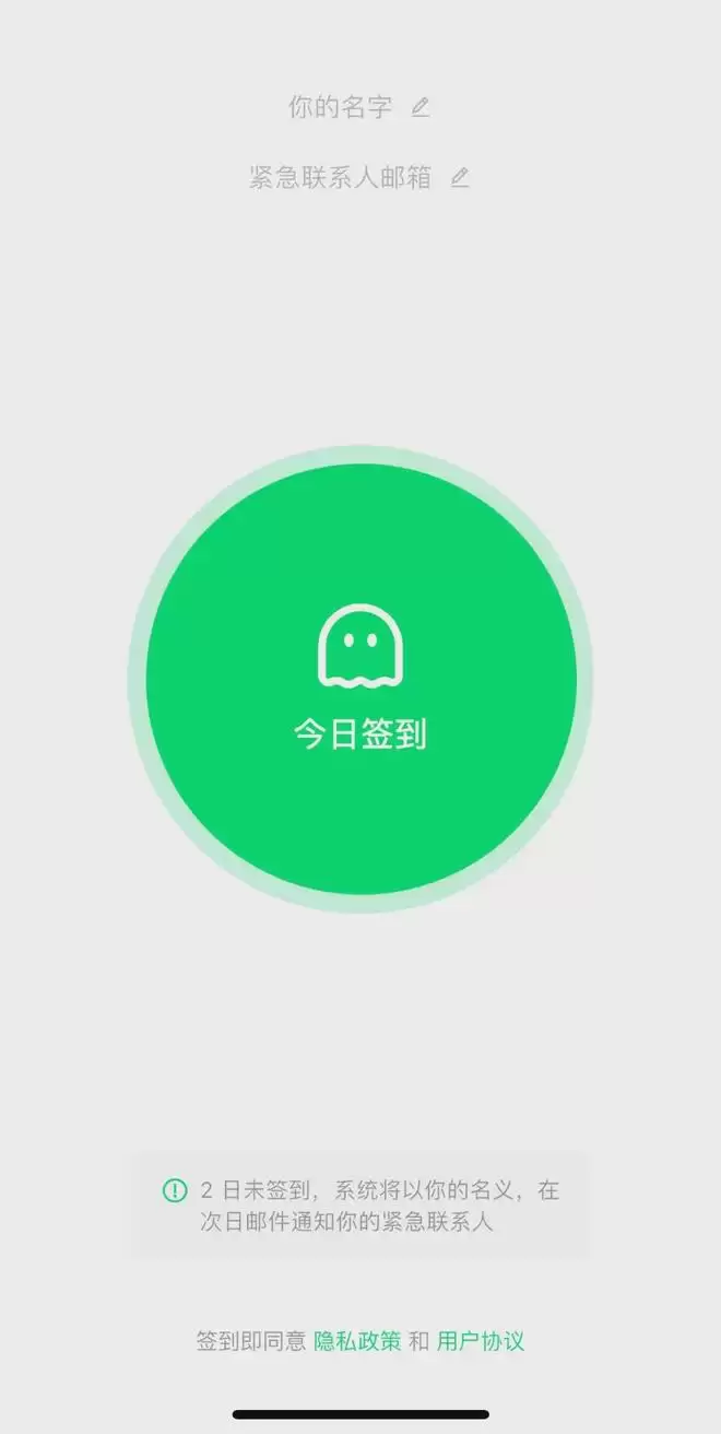 记者购买下载该软件后,发现该软件界面较为简洁。中间有一个“签到”按钮,并提醒“2日未签到,系统将以用户的名义,在次日邮件通知用户的紧急联系人”。